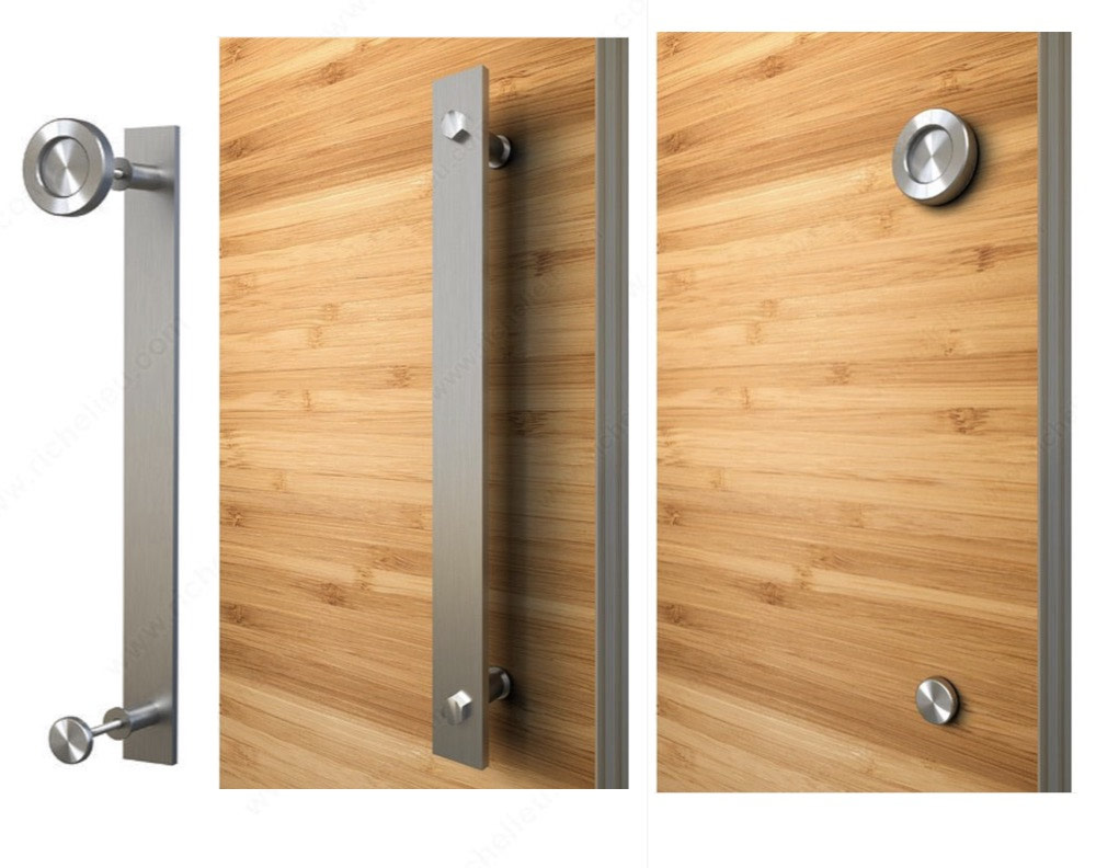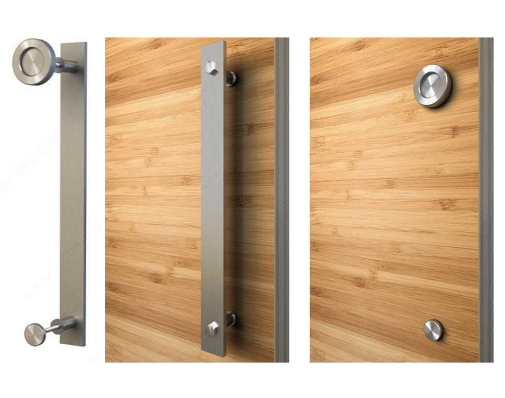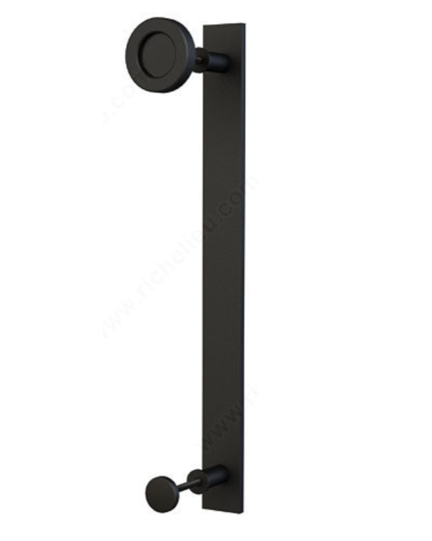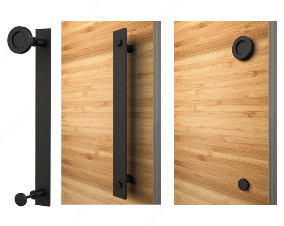 Wall mounted track and hardware Essentials Combined pull and knob: flat bar on one side with a flat disc on the other. Screws for two door thicknesses: 35-45 mm and 45-55 mm